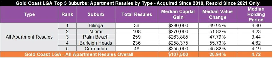 The table below provides a summary of the Gold Coast’s top five suburbs in terms of apartment resales performance since the start of 2021 by median capital gain. It is important to note that only those properties that had been acquired anytime since the start of 2010 and resold anytime since the start of 2021 have been included in the following analysis. Furthermore, only those suburbs with a minimum of five resales were considered for inclusion, in order to use somewhat reliable sample sizes.