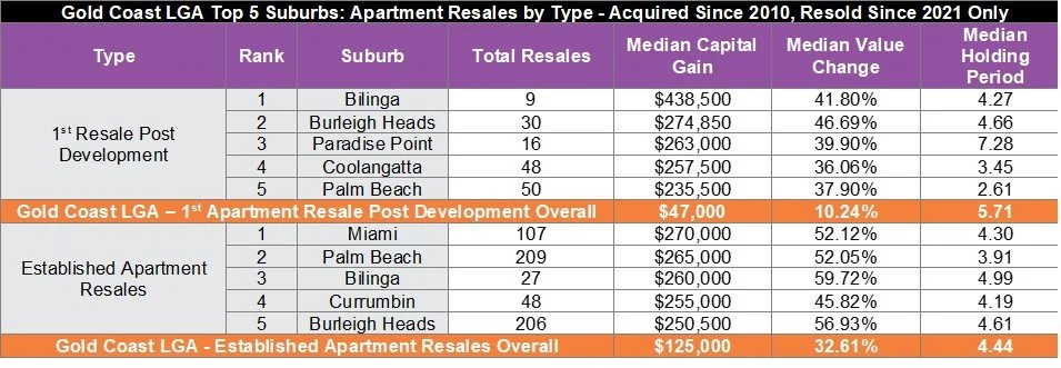 Delving further into the results presented above, the following table provides a breakdown of the Gold Coast’s top five apartment resales suburbs by product type, comparing results achieved by those who had purchased and resold established apartments and those who had resold an apartment that they had previously acquired brand new, from a developer. This is an important distinction to make as each product type hosts their own unique benefits, constraints and buyer profiles. Again, only those properties that had been acquired anytime since the start of 2010 and resold anytime since the start of 2021 have been included in the following analysis. Furthermore, only those suburbs with a minimum of five resales were considered for inclusion, in order to eliminate those with potentially skewed results.