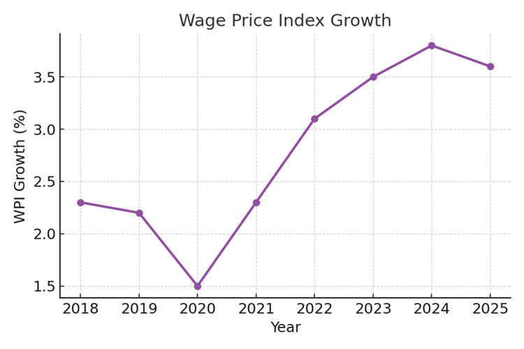 • Wage growth (WPI): Still near 3.8% y/y — strong enough to risk embedding inflation and a possibly a noose around productivity gains as is the next point.