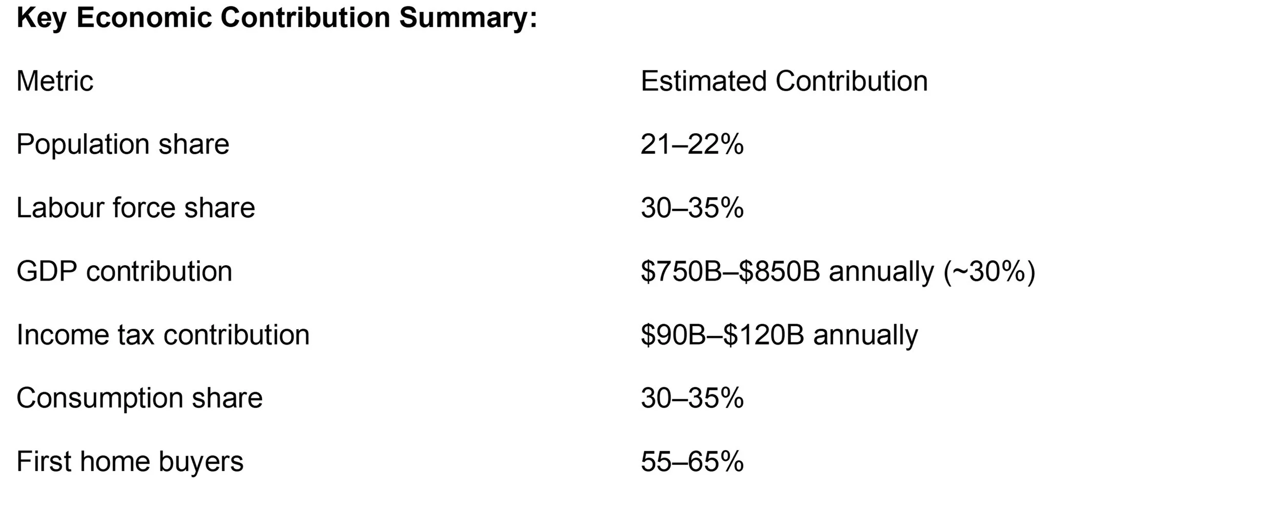 Given labour represents the majority of economic production, this cohort contributes an estimated $750 billion to $850 billion annually to Australia’s $2.6 trillion economy—approximately 30% of GDP. This makes them one of the most economically significant demographic groups. They are also an age group that usually have less demand on the healthcare sector and social services of the nation. Their consumption patterns are typically quite high, particularly when young families are considered, first home ownership or moving into rental properties.