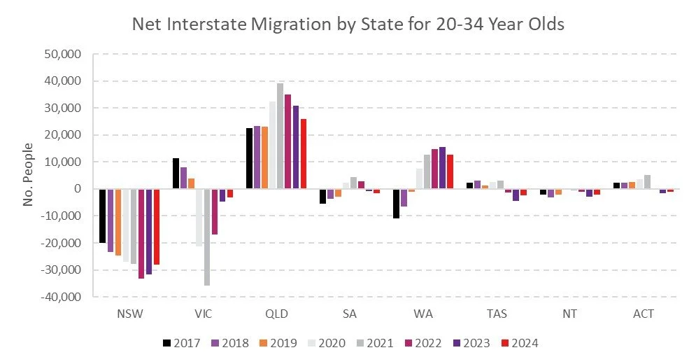 As Australia continues to evolve economically, the contribution of young adults aged 20–34 remains essential. Their productivity, innovation, and consumption will shape the country's economic trajectory for decades to come. Policies that support employment, housing access, and business formation for this cohort will be critical to sustaining national prosperity and likely grow the States they settle in. Whilst QLD and WA appear to be the net beneficiaries right now; the author wouldn’t be surprised if VIC turned their negative migration trend around and saw the younger population start to relocate to Greater Melbourne. This would be not only for the job opportunities that are present, culture and events; but also the significant residential price advantage when compared to Greater Brisbane and Greater Sydney.
